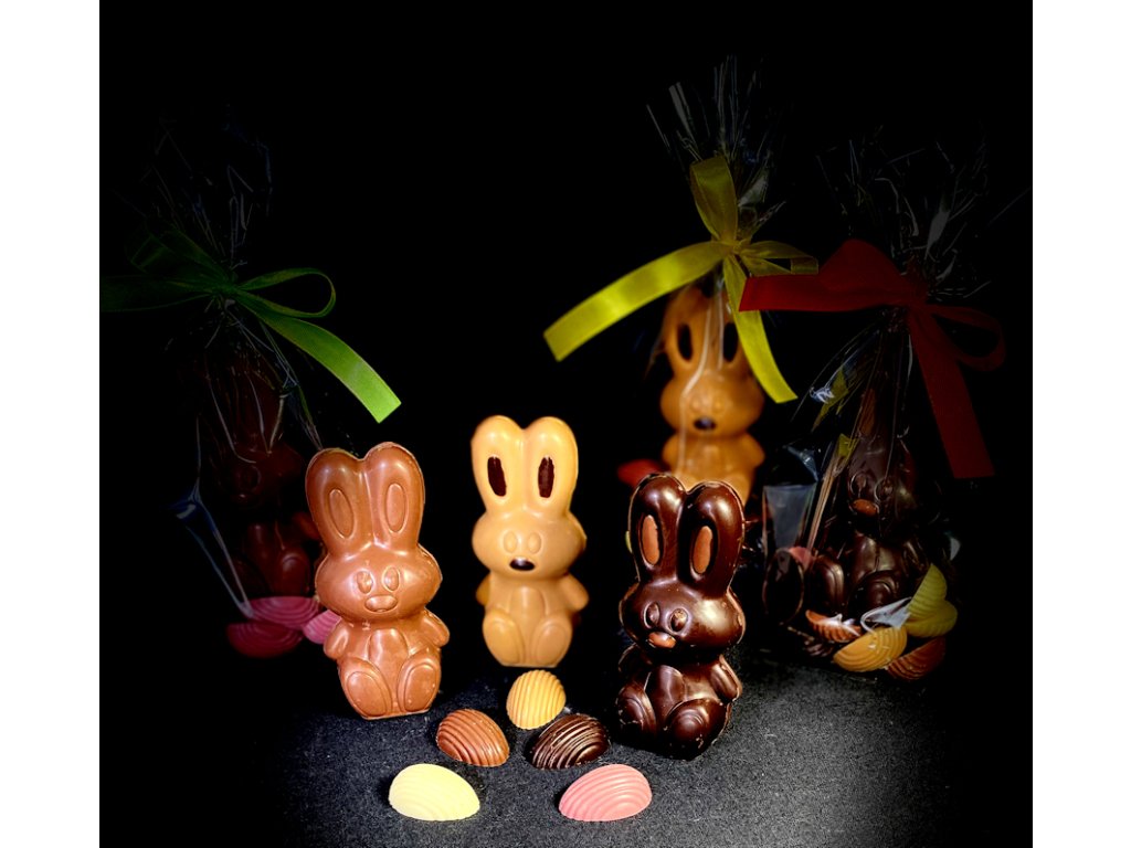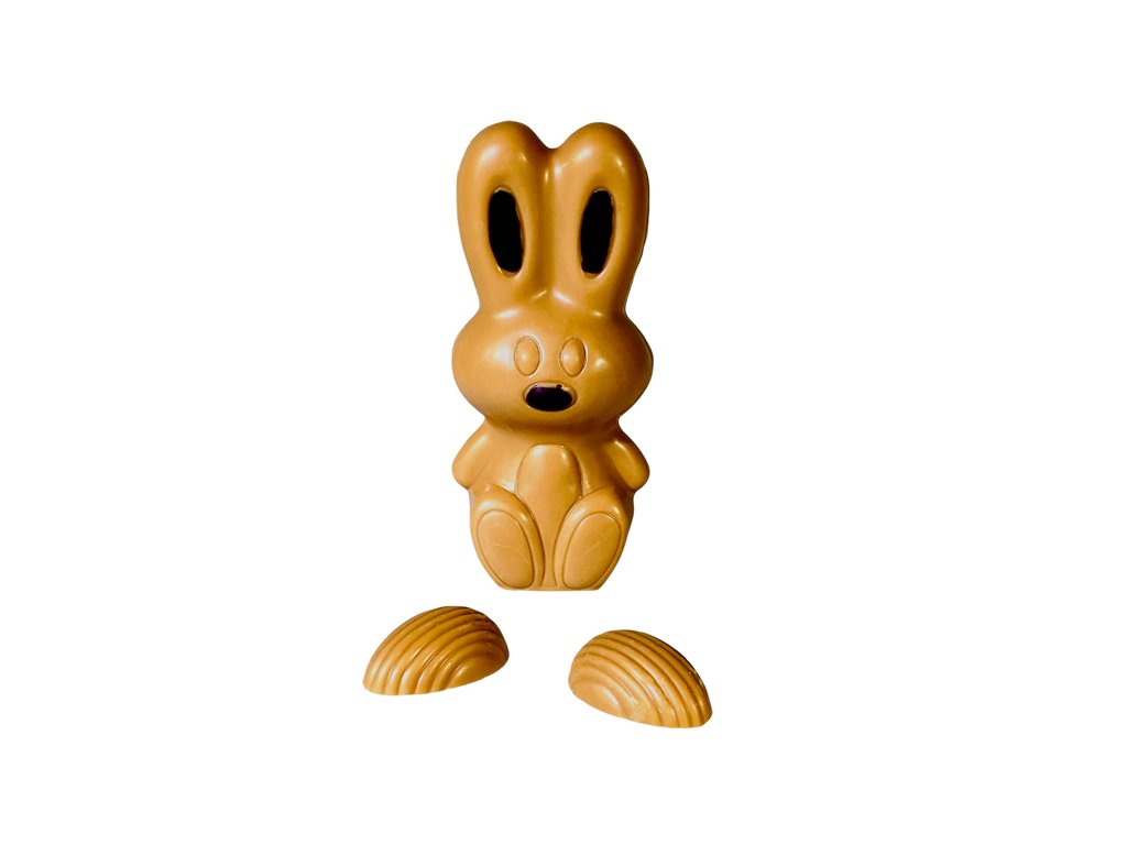 Ručně dělaný čokoládový zajíc z KARAMELOVÉ čokolády doplněný čokoládovými „půlvajíčky“ z 5-ti druhů čokolád . Přes 115 g úžasného, a nejen velikonočního, mlsání.