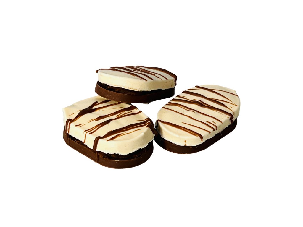 Kombinace naší kávové pralinky ( mléčné 40% francouzské čokolády a kávy ) vytváří, spolu s pomalu pečeným laskonkovým korpusem, úžasnou křupavou zábavu přesně tak akorát pro vaší pusu.