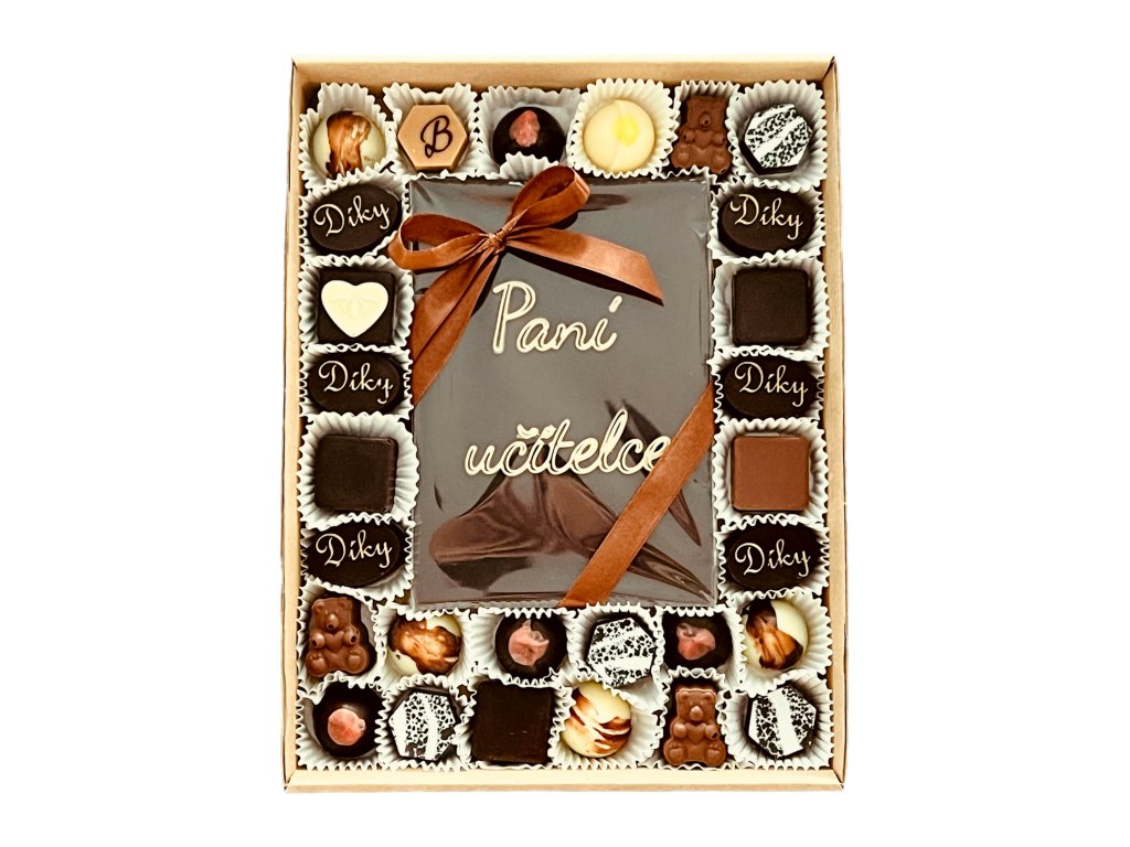 Cca 28 pralinek (podle velikosti), doplněný „čokoládovým přáním“, tedy 200g tabulkou čokolády s textem na kterém se můžeme domluvit ( s omezenou diakritikou :-), ostatně stejně jako na obsahu. Bonboniéra je určena pro skutečné mlsouny nebo jako skvělý netradiční narozeninový dárek